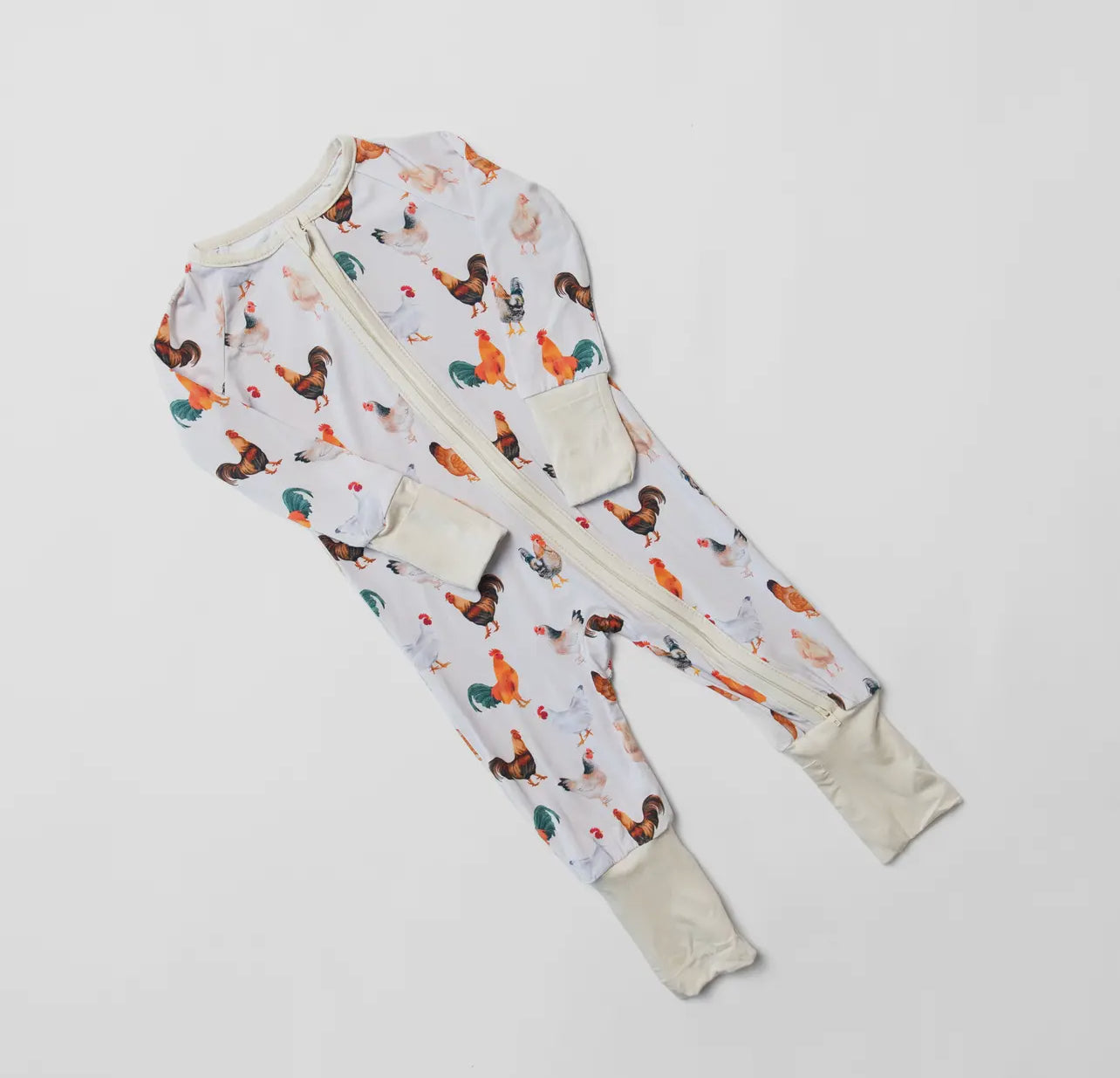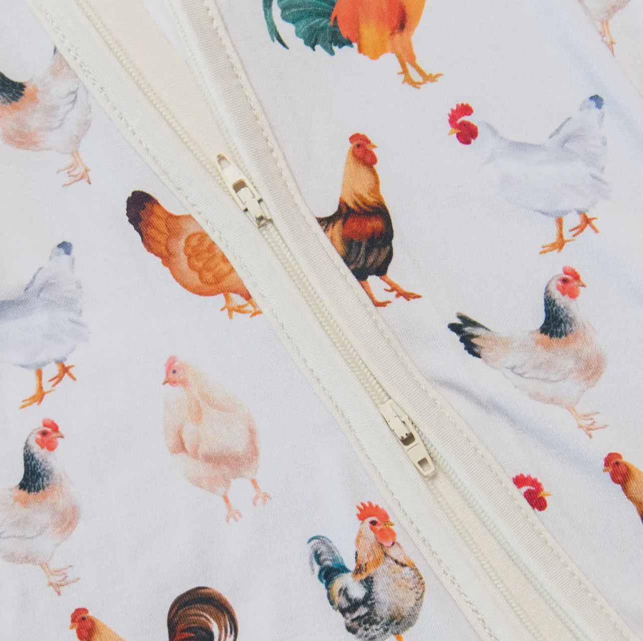 White bamboo sleeper with chicken print. Features a double zipper for easy changing, and fold over mittens and feet. American Farm Company Brand.