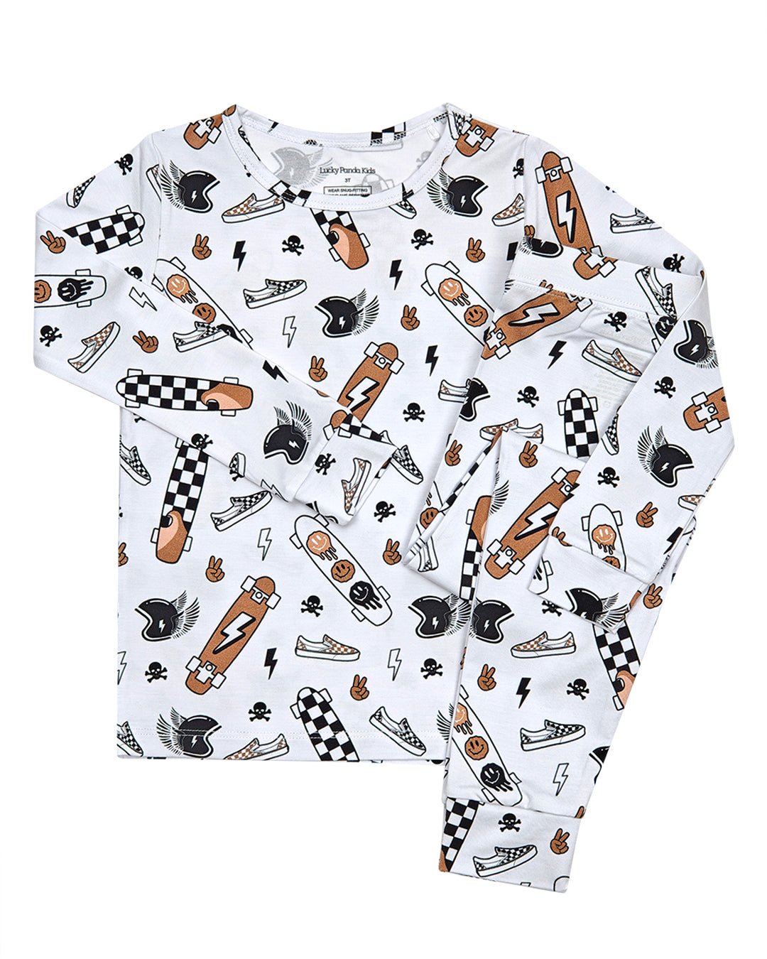 Meet the Bamboo Two Piece Set | Sk8er—featuring playful skateboards, tiny sneakers, and bold graphic pops that bring street-style energy to every move.