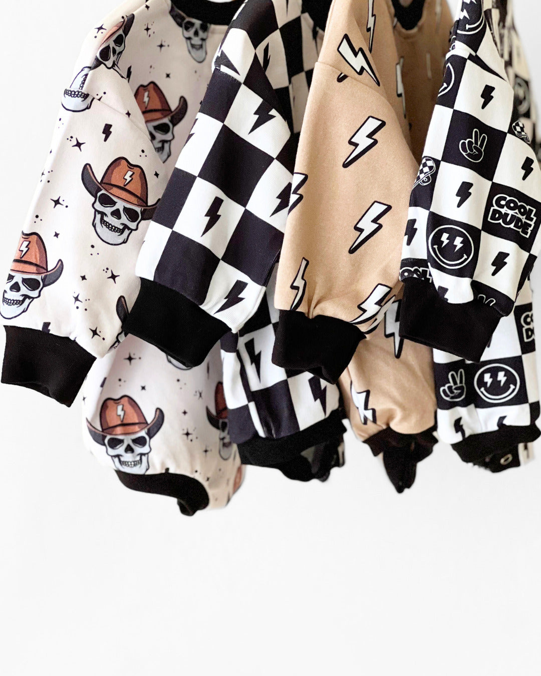 Add some spark to your little one’s outfits with the Bolt Cowboy romper! The eye-catching design of skulls wearing cowboy hats makes this long sleeve bubble romper a standout piece. Made from a soft and stretchy 95% cotton and 5% spandex blend, it’s perfect for stylish, on-the-move little ones.