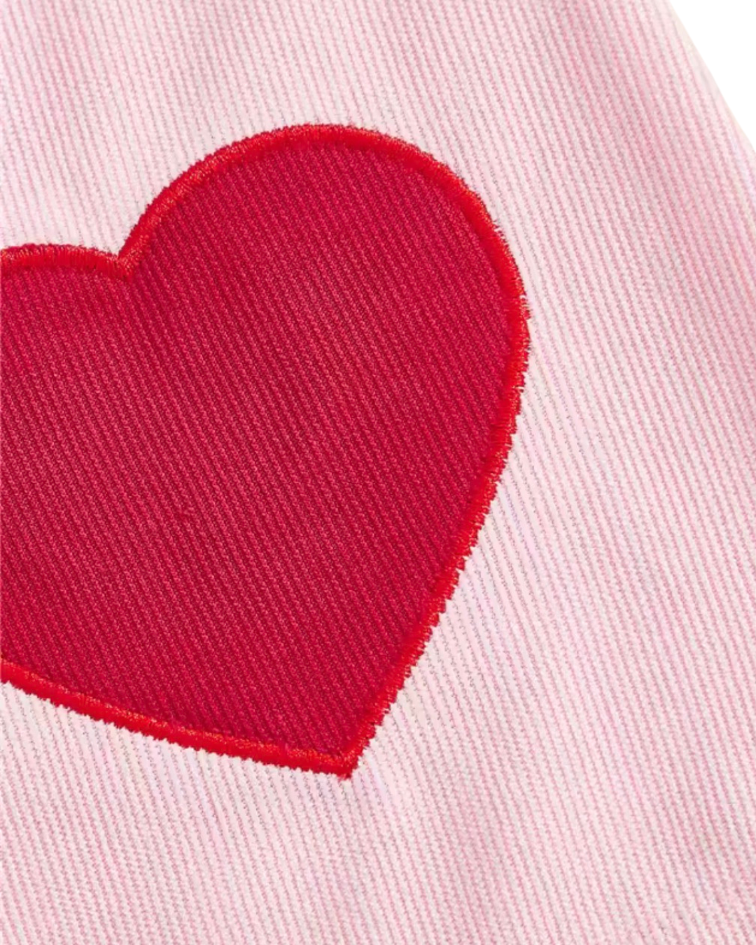 Pink and red color block corduroy dress with stitched hearts.