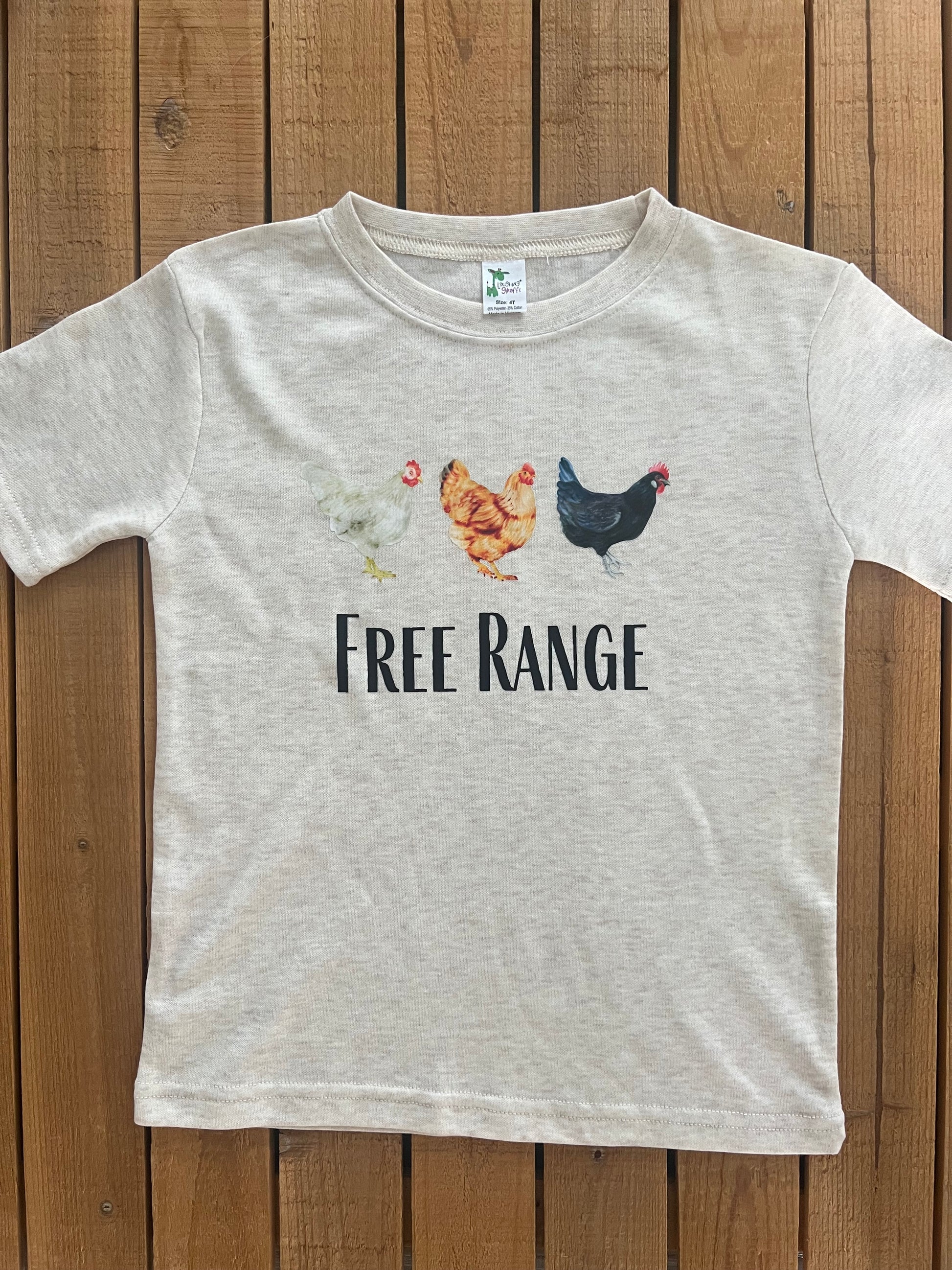 Heathered oatmeal Laughing Giraffe tee or onesie with “free range” chicken print graphic.