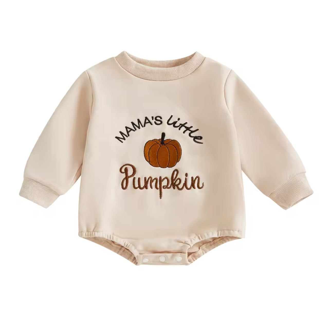 Cream crewneck romper with "mama's little pumpkin" embroidered design.