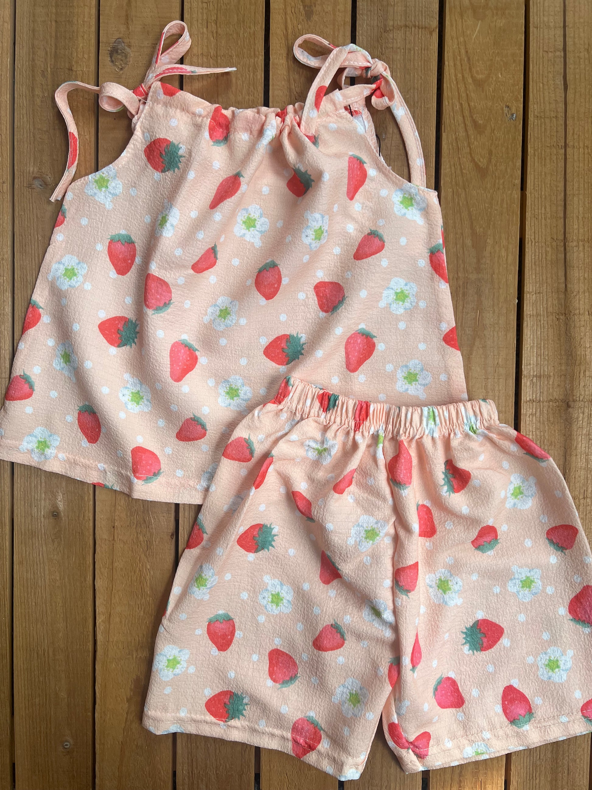 Peach tank with tie shoulders and polka dot strawberry and daisy print. Features matching shorts with elastic waistband.